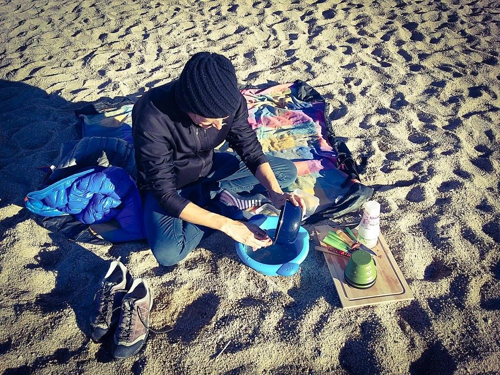 Après une chaude journée au soleil, vient le temps de la douche à l’eau… la vraie, celle qui coule sur le corps et qui fait la chair de poule. Parce que la toilette mode lingette a vite ses limites… Problème il fait 15°; il y a du vent et que de l’eau froide sur la plage.
