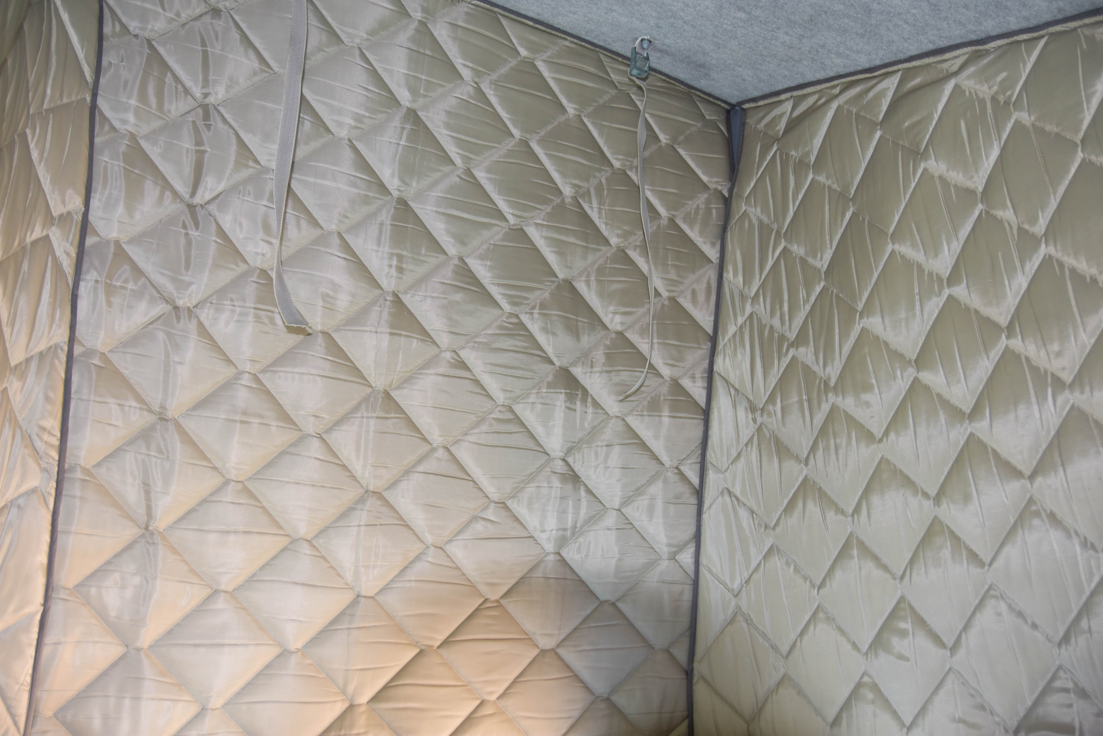 L’ensemble se fixe facilement avec un velcro déjà en place sur le haut des panneaux et qui vient griffer directement la moquette du plafond
