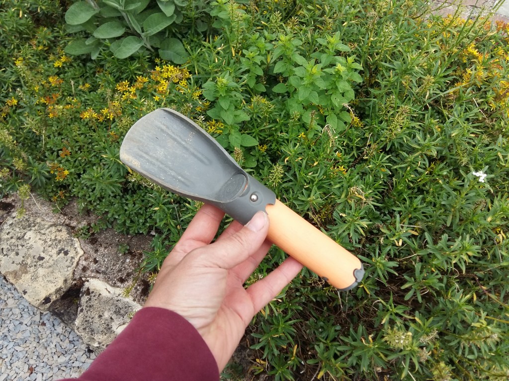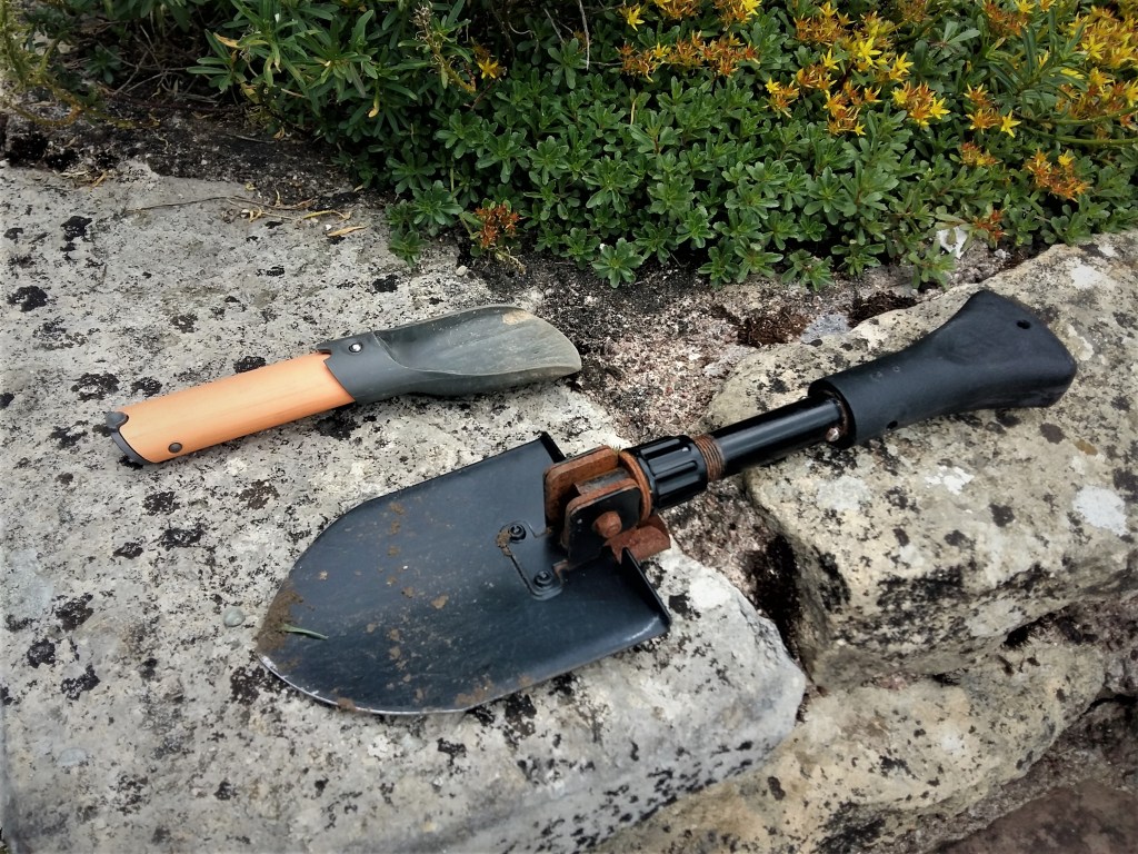 La grande est une pelle militaire pliable achetée en promo dans un magasin de pèche qui fermé boutique. Cela vaut de 10 à 50 euros suivant le lieu d’achat. La grande chaine de magasin de sport « A fond la forme » en propose aux alentours de 12 euros. Certains sites de survivalistes ou de vie nomade en proposent des performantes, avec un côté tranchant pour faire hache, un manche creux avec nécessaire de survie… Chez nous, cette pelle a sa place dans le coffre sur le côté du tiroir, à côté d’une hache (pour les feux de camps) et d’un stock de cordelettes (file à linge, cabane, haubanage d’abris…).