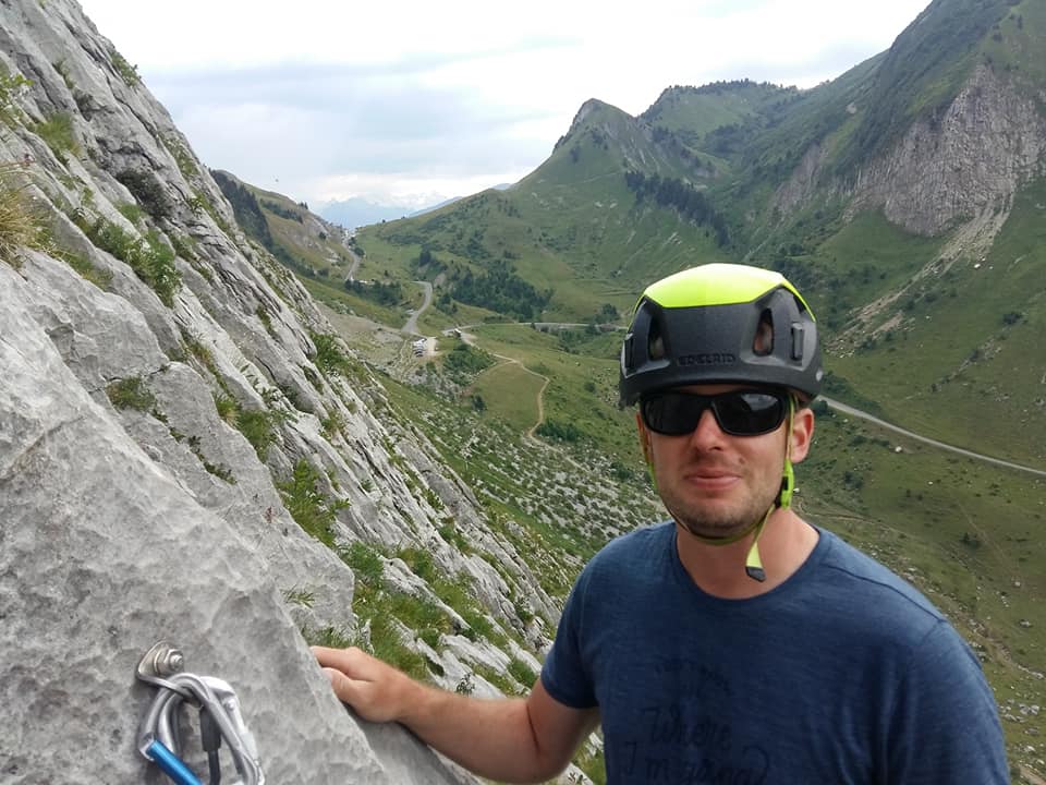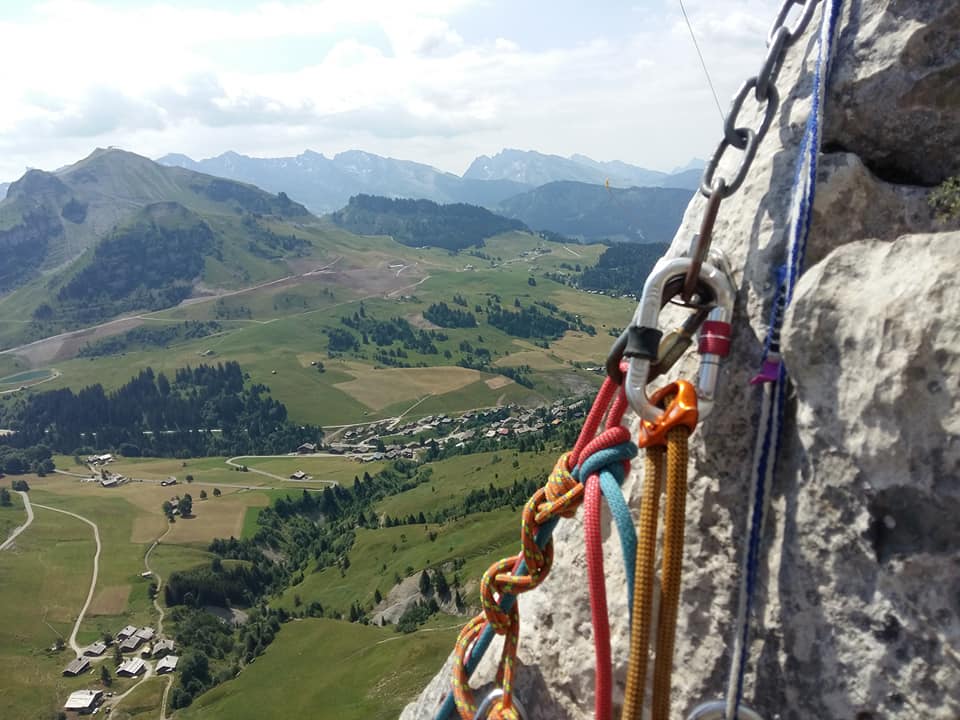 Nous sommes au col de la Colombiere dans les Aravis pour « les Gaguistes » sur le pic Jallouvre. 250m de haut pour 6 longueurs en D 6a>5c.