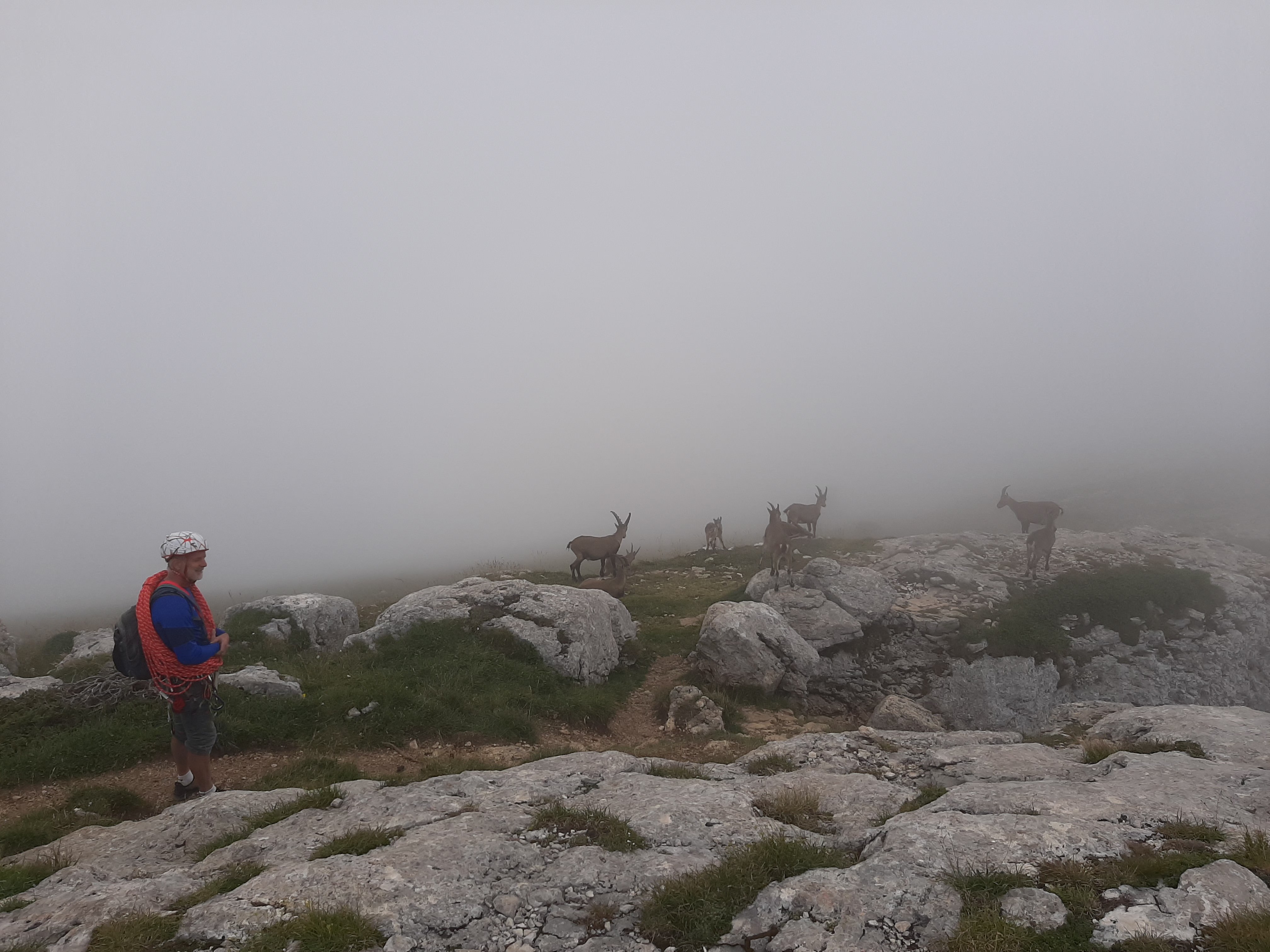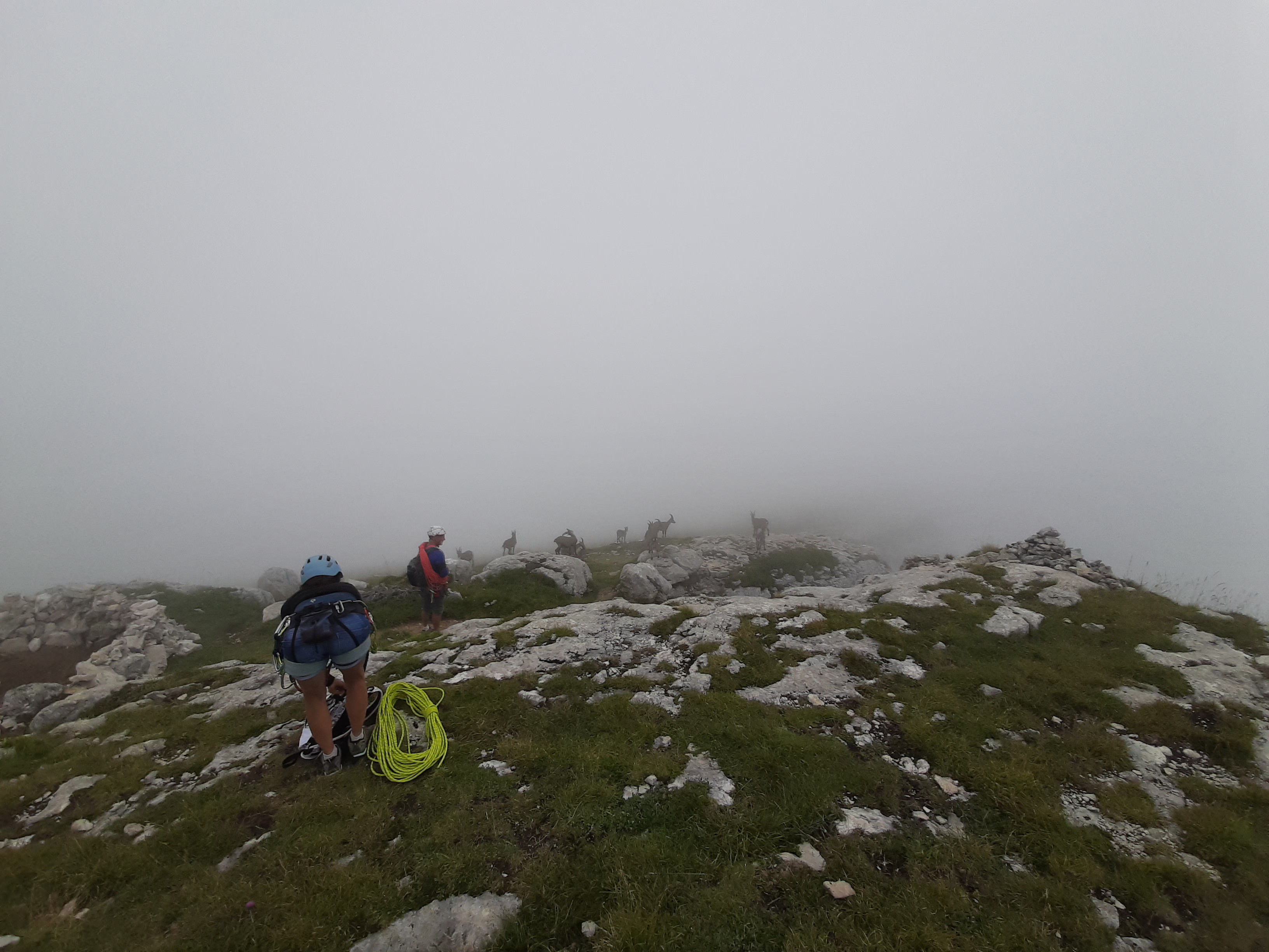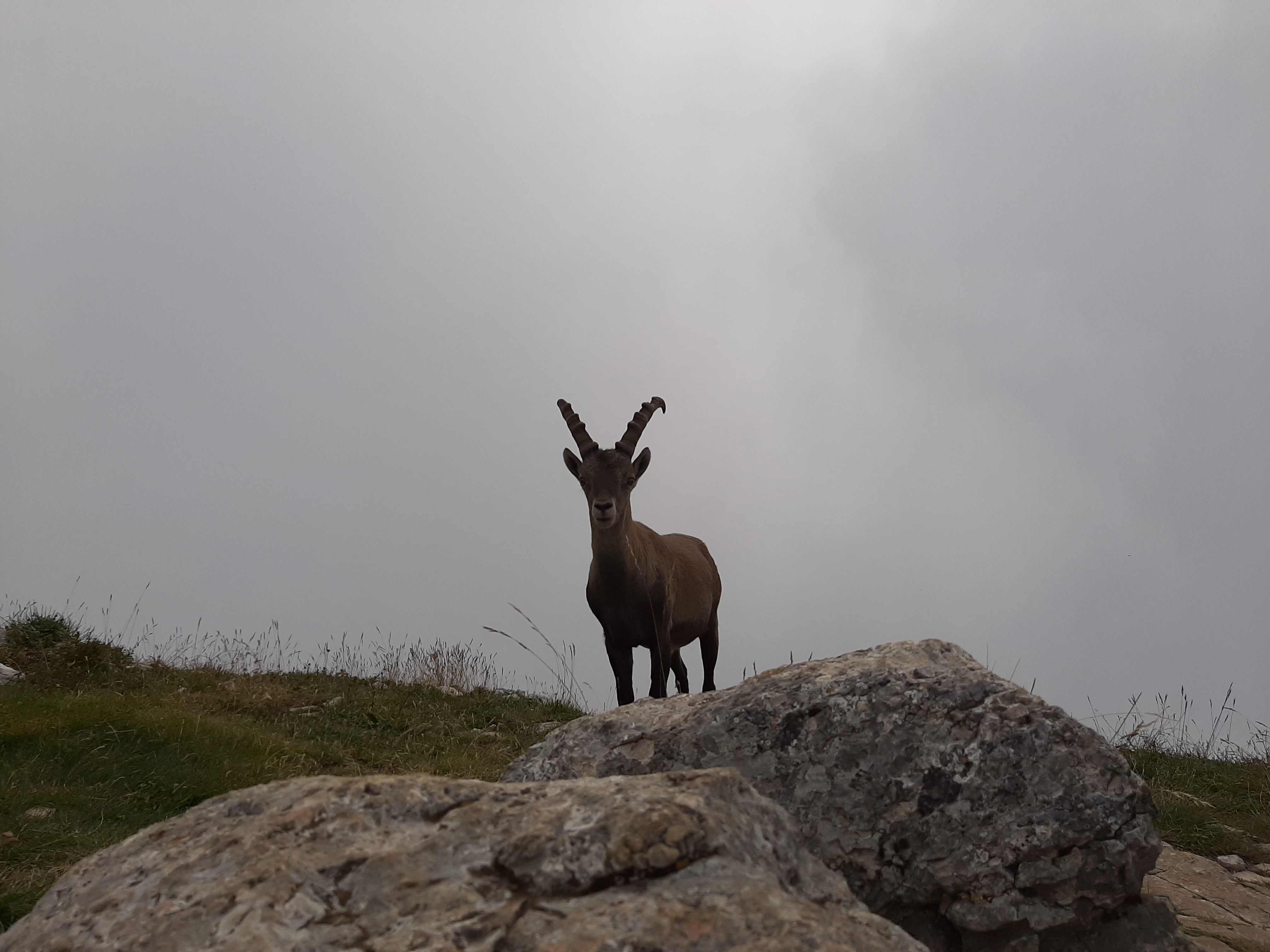 Résultat, un peu plus de 1h30 d’ascension dans le brouillard et une arrivé au sommet dans les nuages. Il parait que la vue est splendide la haut. Il faudra revenir pour juger. Nous avons tout de même la compagnie des bouquetins au sommet.