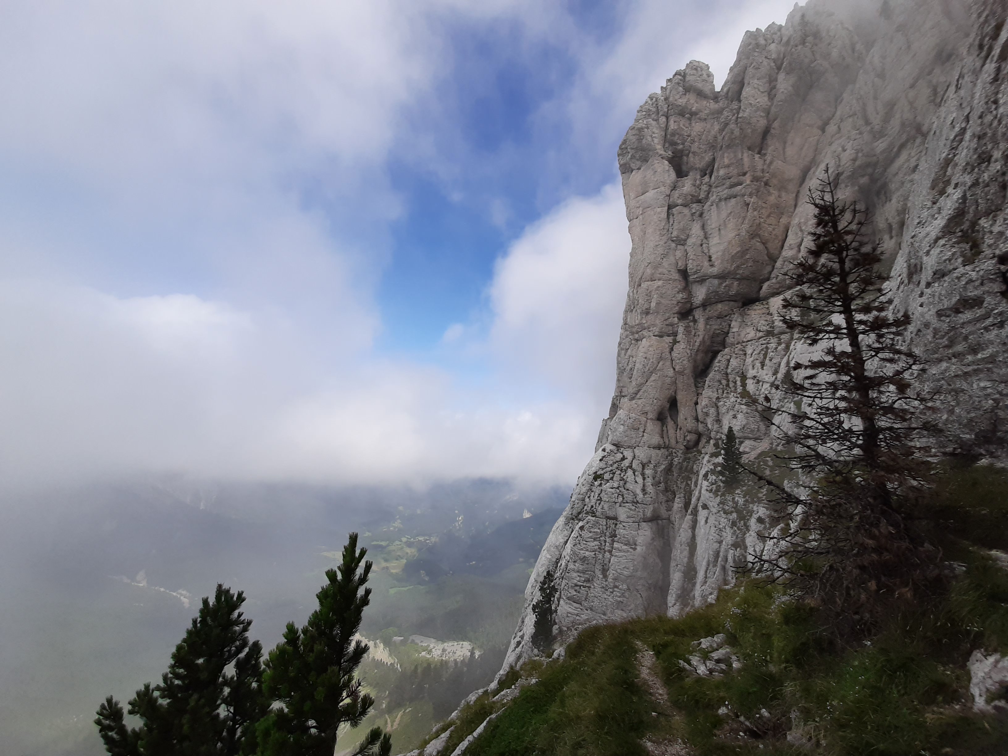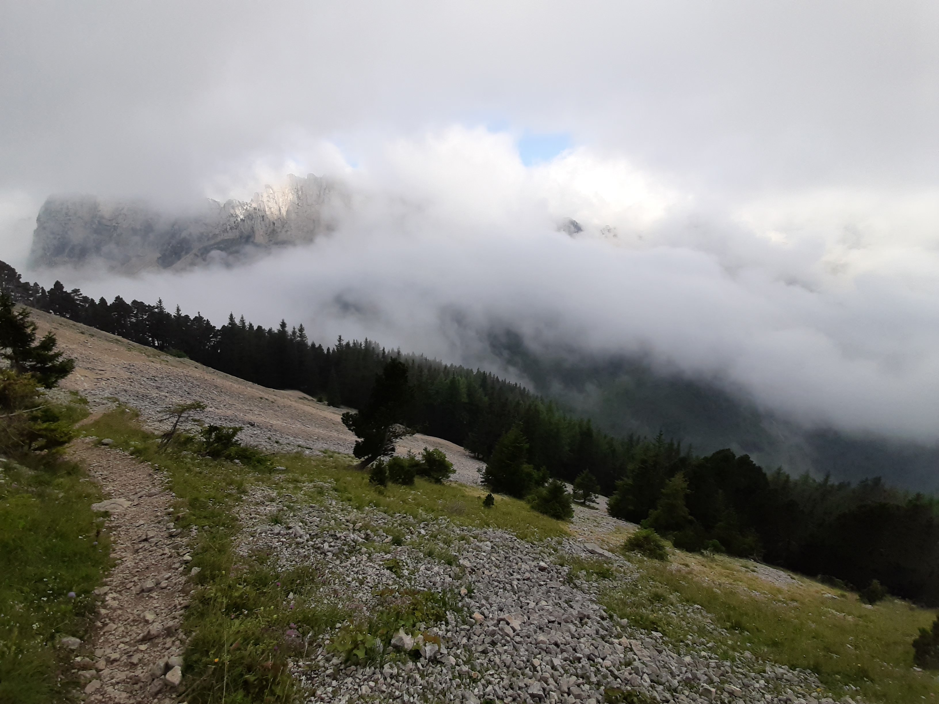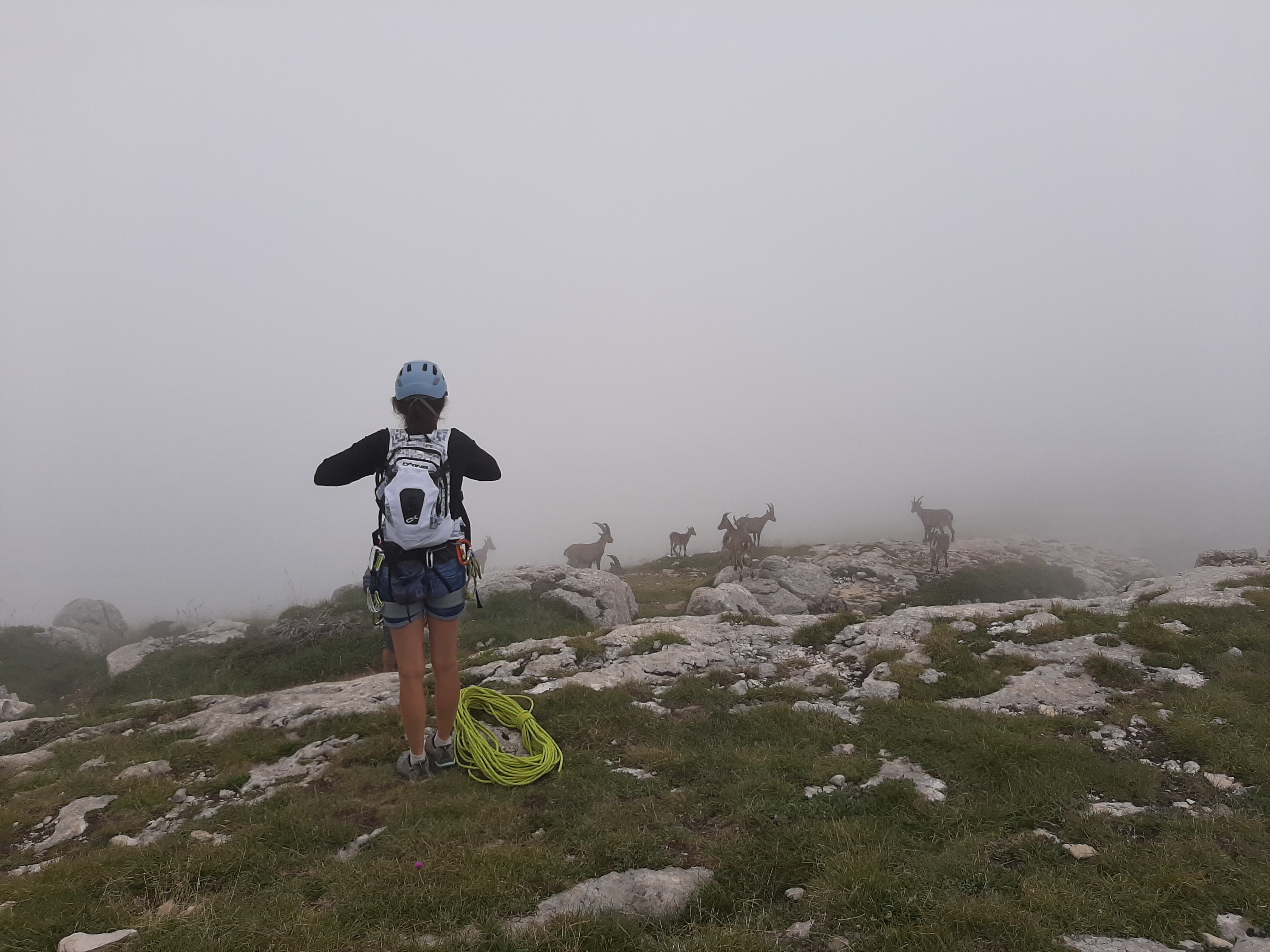 Résultat, un peu plus de 1h30 d’ascension dans le brouillard et une arrivé au sommet dans les nuages. Il parait que la vue est splendide la haut. Il faudra revenir pour juger. Nous avons tout de même la compagnie des bouquetins au sommet.