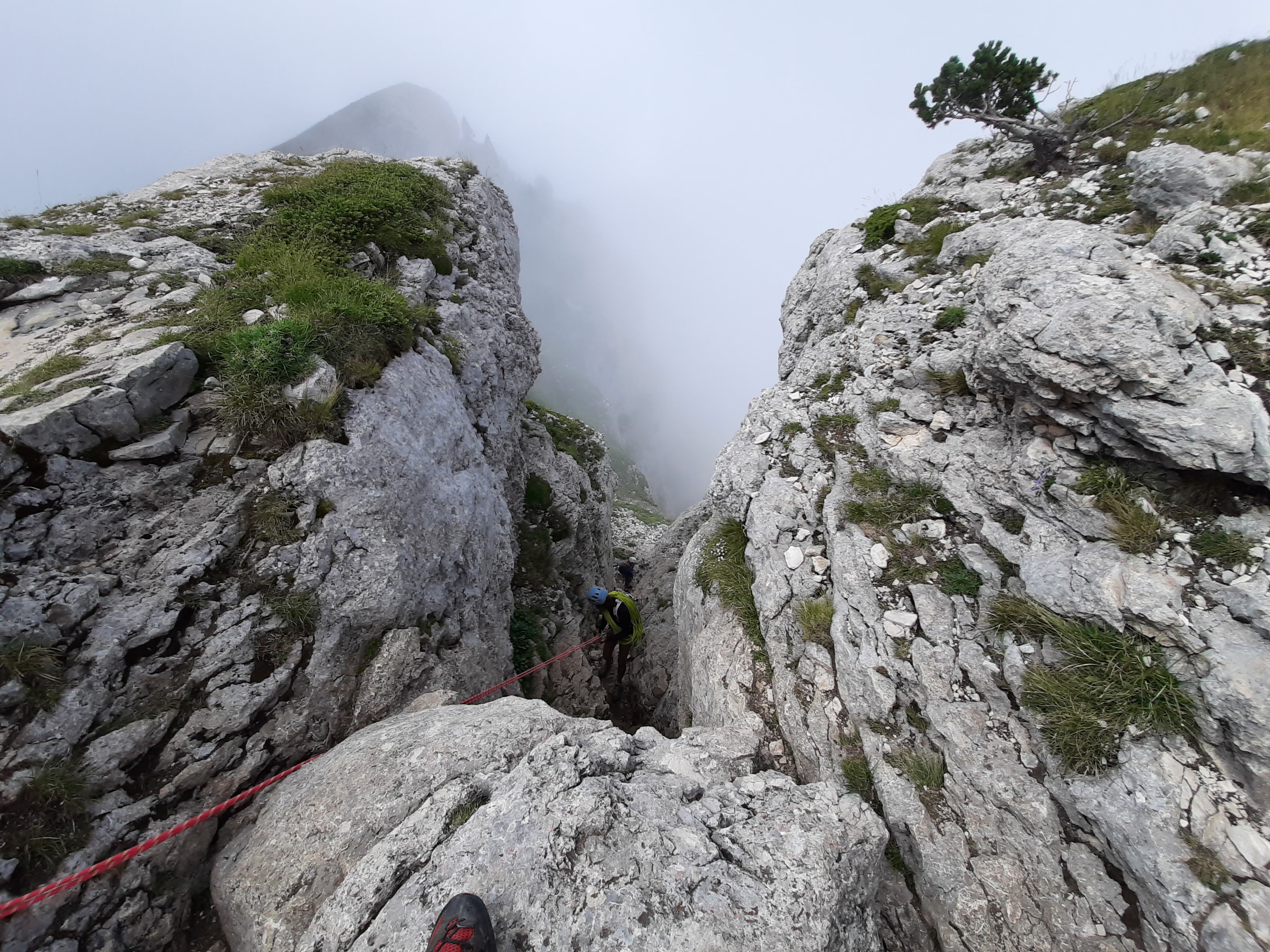 La descente se fait par la voie retour avec une série de rappel. Il faut bien 2 brins à 50m pour cette étape. Nous avions un rappel à 60m, nous étions serein.