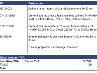 La recherche de ces deux pièces nous avait réellement permis de faire la réparation de notre van et de résoudre un problème de perte de liquide. A ce moment-là, nous avions commandé sur le site marchand Sérial Kombi (lien en bas de page). La facture était d’ailleurs bien détaillée, histoire de faire une dernière vérification avant réception des pièces.