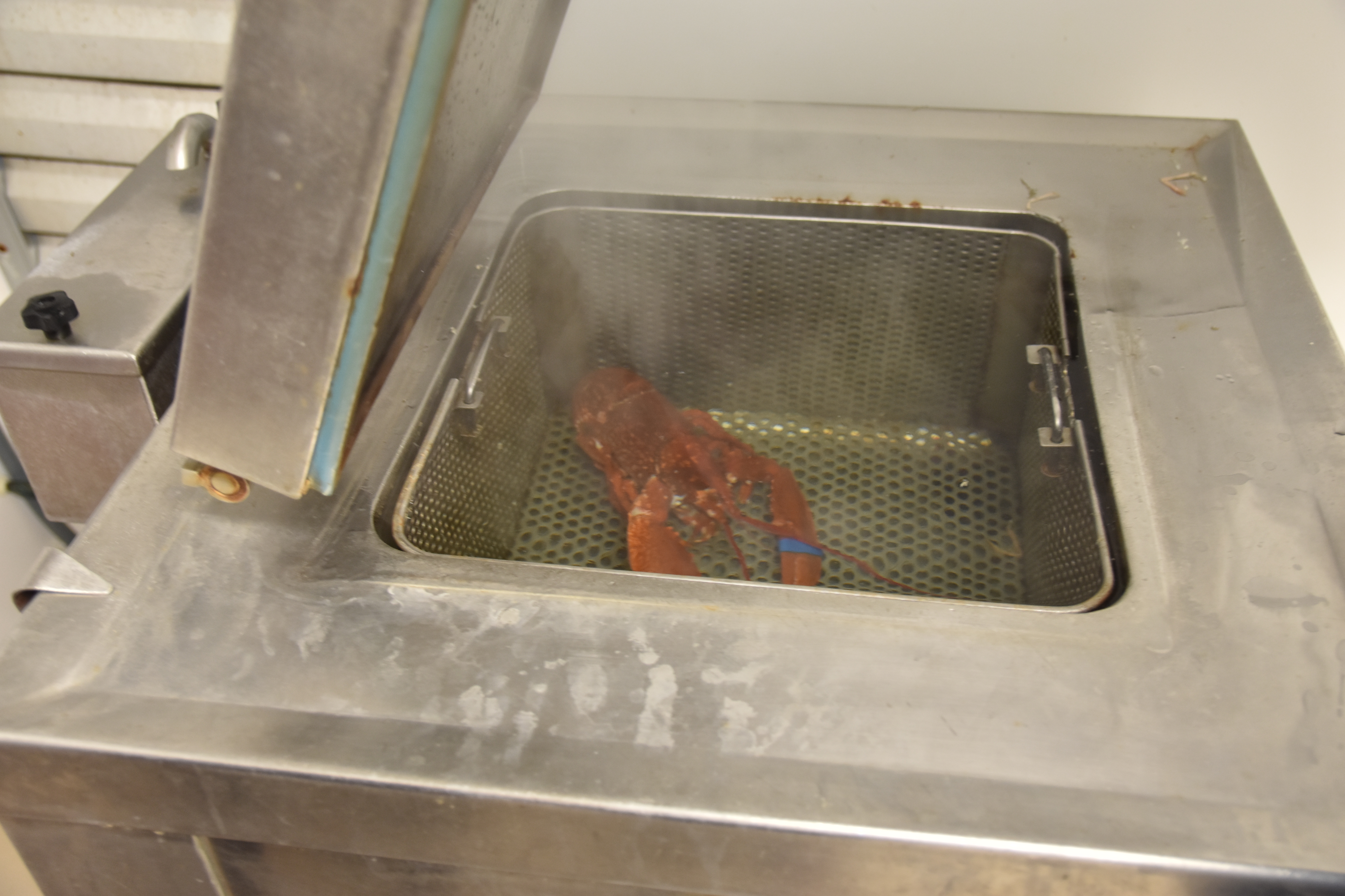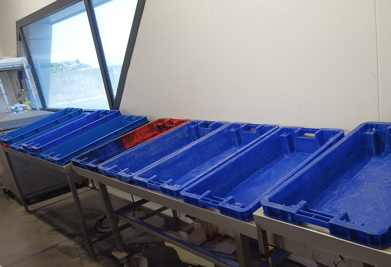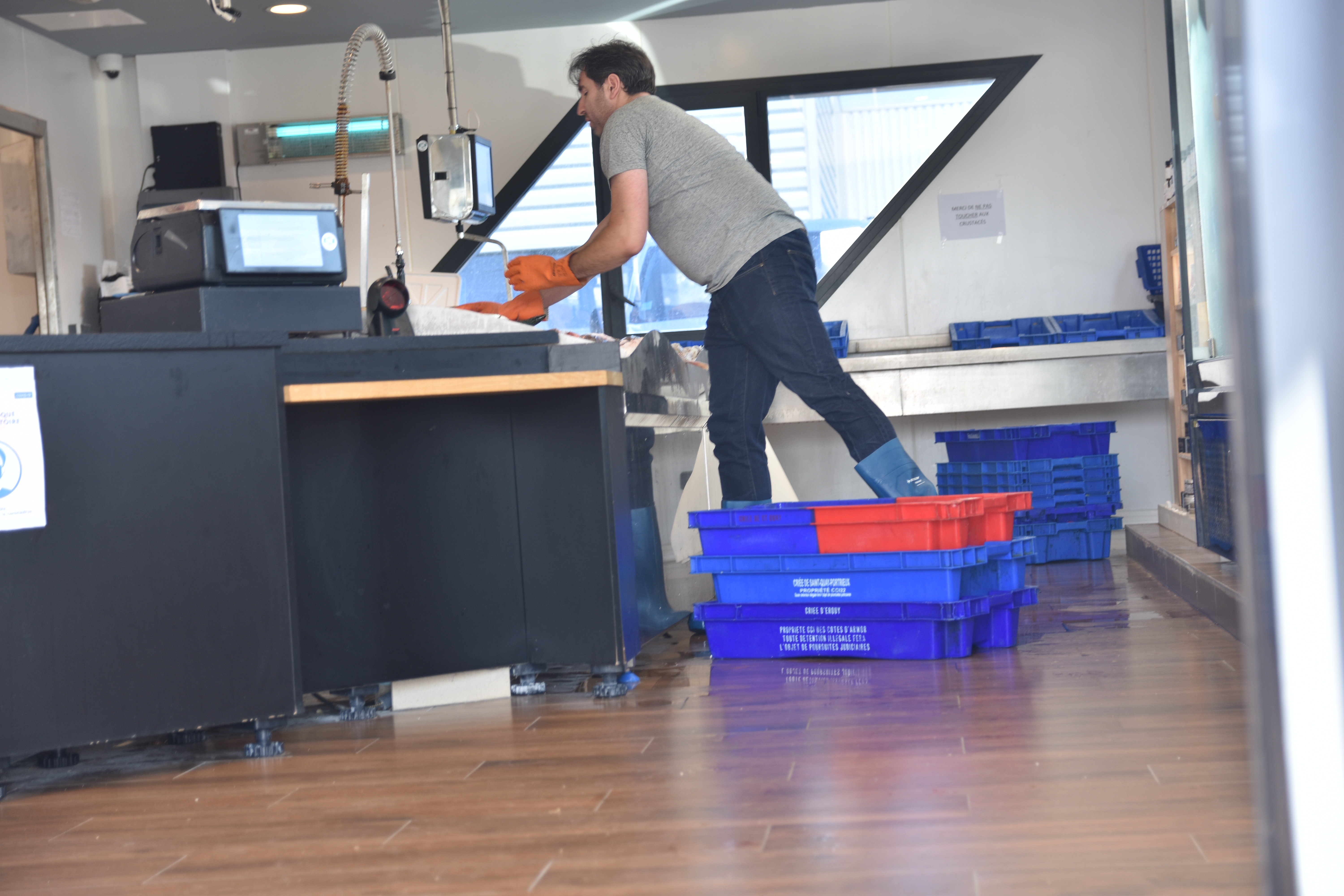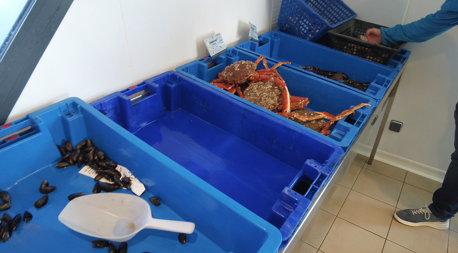 Petit passage express par la salle de cuisson. Lors de la commande de fruits de mer par exemple, les crustacés sont prêts à être mangés. Il y a une phase de cuisson avant emballage, une cuisson à l’eau de mer. L’entrepôt est relié à un réseau d’eau de mer traitée pour ce genre d’utilisation. La cuisson à l’eau de mer apporte plus de goût aux chairs.