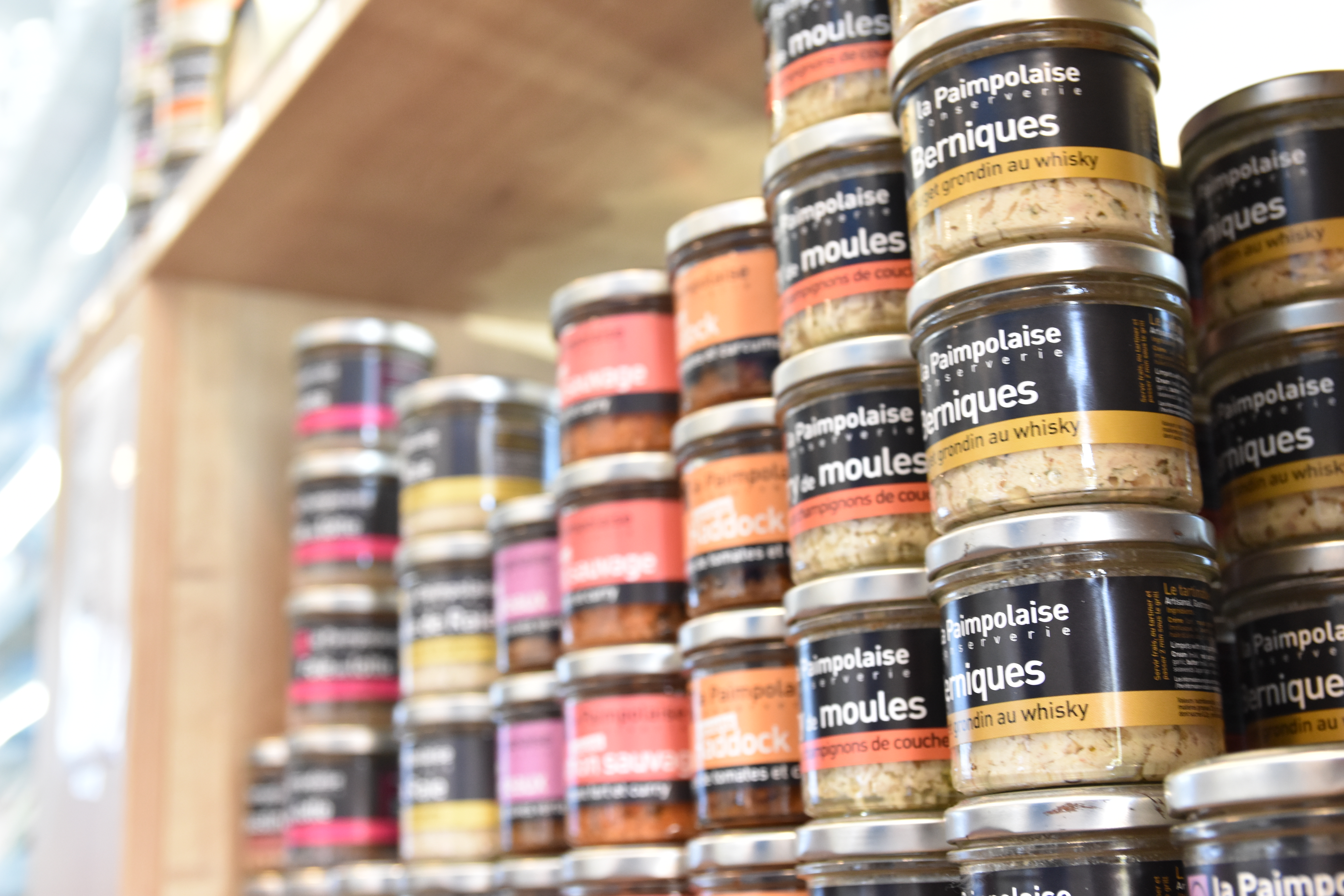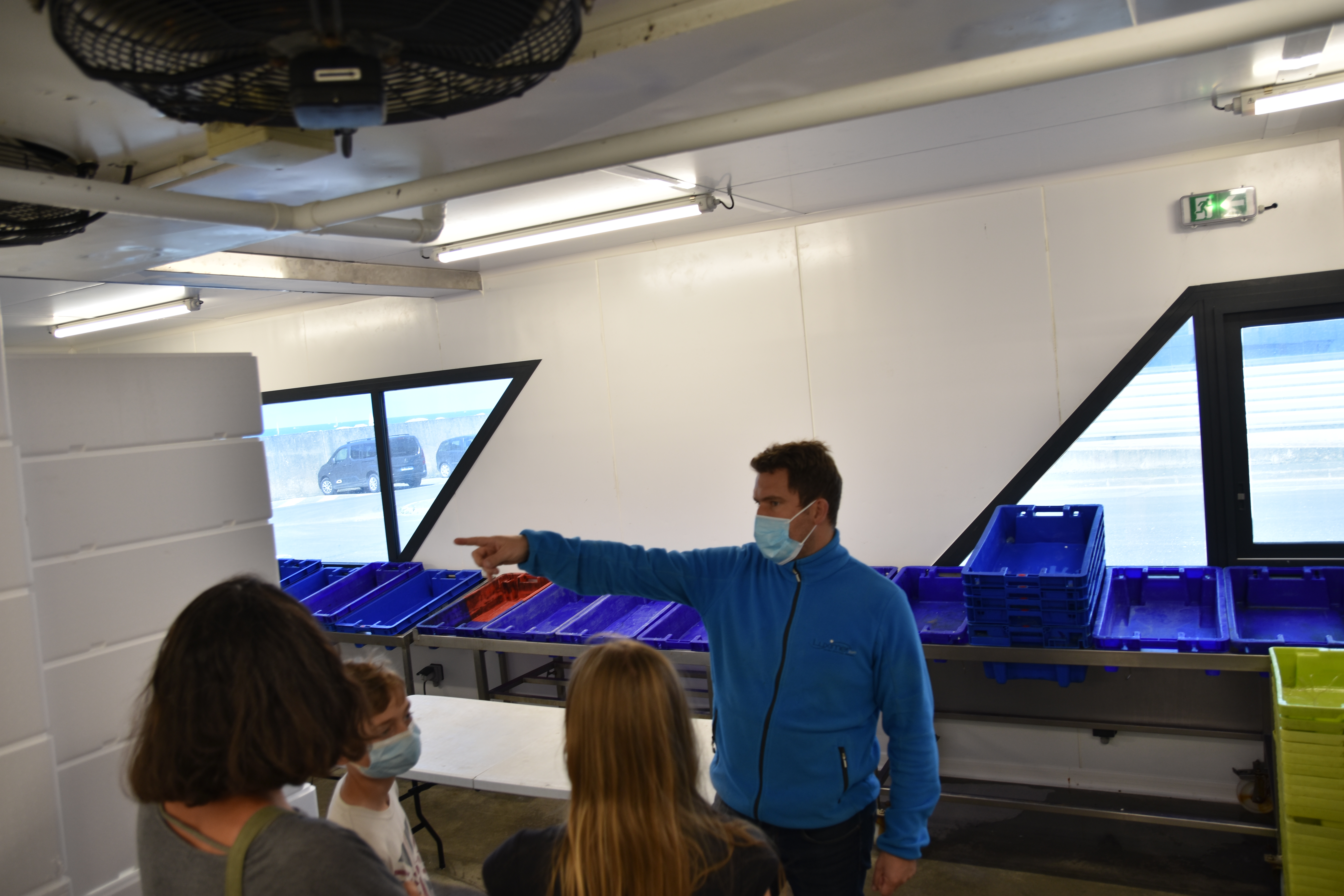 Suite de la visite par le magasin. Espace de vente direct ouvert à tous, y sont présentés : poissons frais, crustacés préparés ou non, mais aussi produits transformés par des producteurs bretons.
