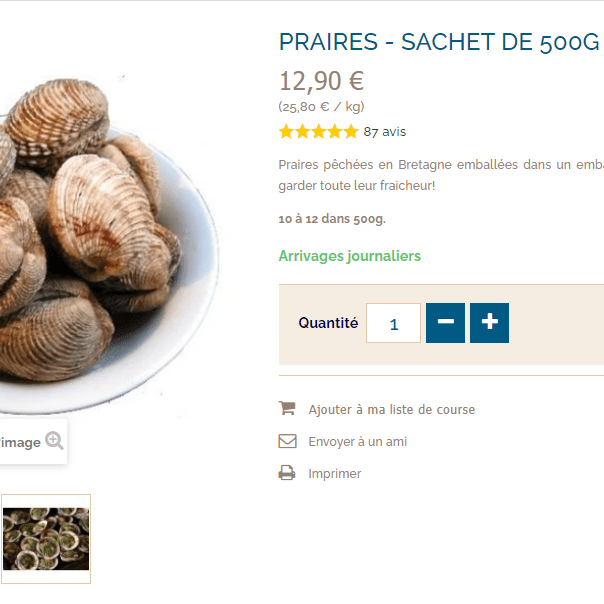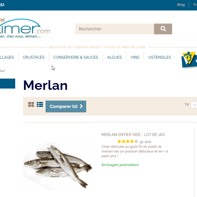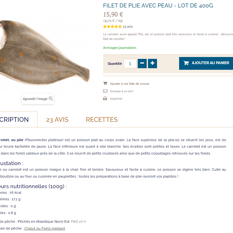 En surfant sur les pages et en passant d’un produit à l’autre, vous allez pouvoir regarder la provenance, la méthode de pêche, la zone de pêche, le produit vient d’un arrivage dans une criée bretonne et surtout le type d’arrivage. Cela vous permet de savoir si la barbue ou le merlan que vous convoitez sort plutôt d’un frigo ou d’un bateau… Souvenez-vous ce que nous disait Stéphane le patron « un poisson sélectionné sur internet n’est pas encore pêché à la commande »… c’est pas faux du coup.