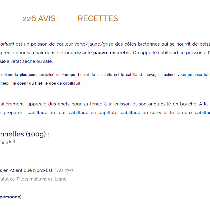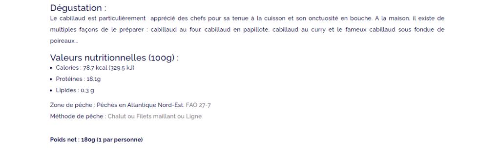 Dans les descriptions, vous trouverez également des indications sur votre poisson, ce qu’il mange à l’état naturel… Une sélection de recettes… Des avis… Vous trouvez donc également sa zone de pêche. Car souvent, en magasin ou sur internet on apprend que tel ou tel produit vient par exemple d’Atlantique Nord-Est ou d’ailleurs. Un intitulé qui ne nous parlait pas spécialement.