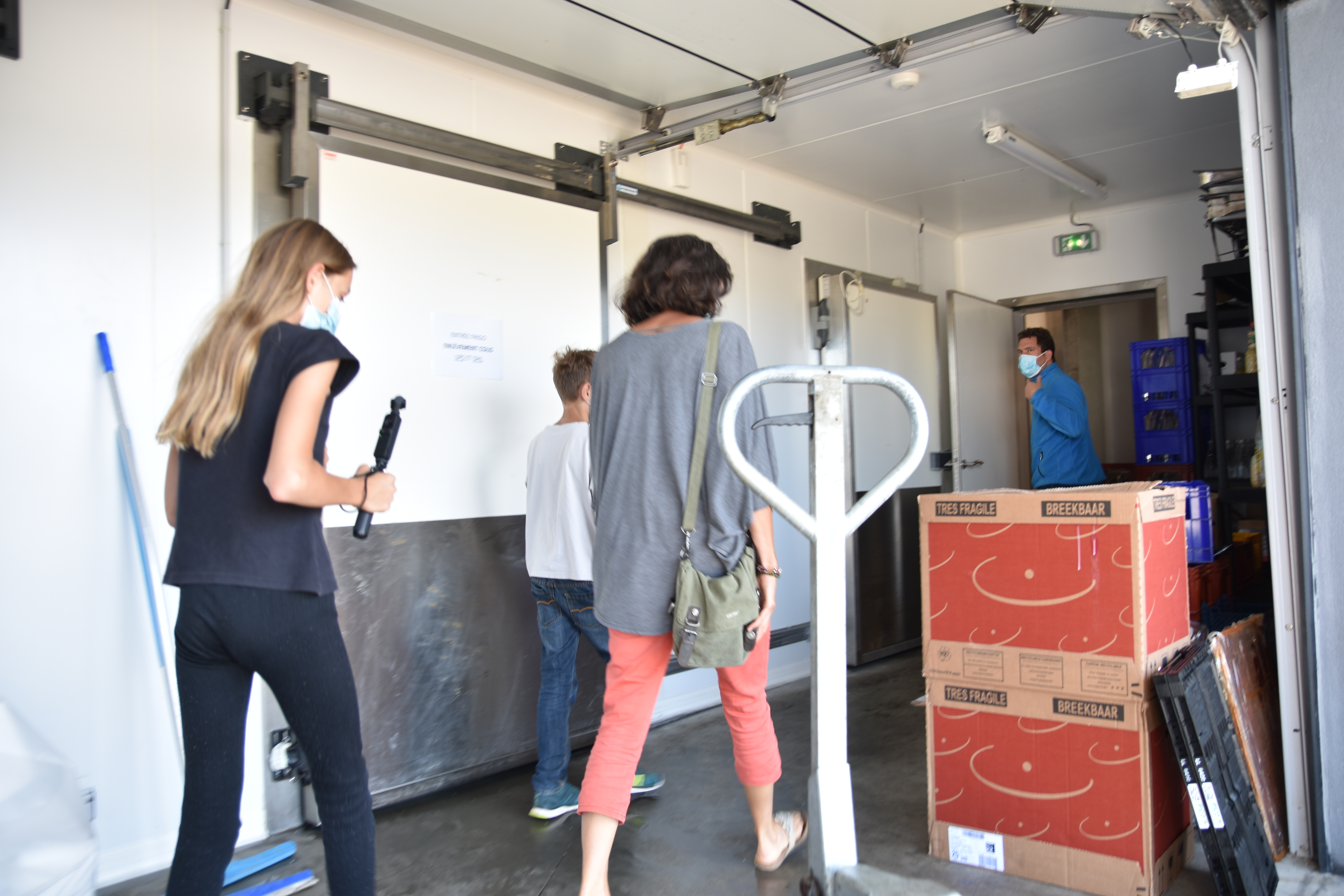 Cet espace de conditionnement est bien vide lors de notre passage. C’est une véritable fourmilière le matin. Les équipes font la préparation de bonne heure. Réception des produits frais, mise en cartons des commandes, préparation et cuisson si besoin. Tout doit être prêt pour 11h00, moment où les premiers transporteurs arrivent pour la livraison client. Nous sommes en plein été et pourtant il faut se vêtir, la pièce est volontairement tempérée à 6°.