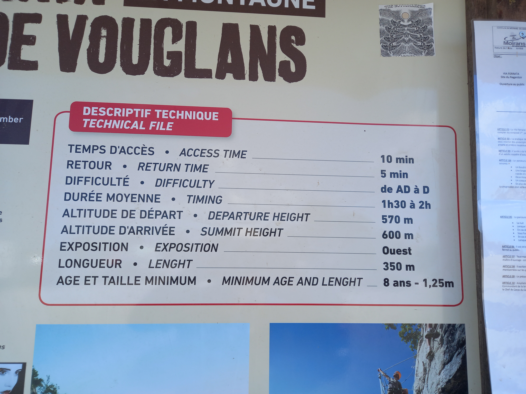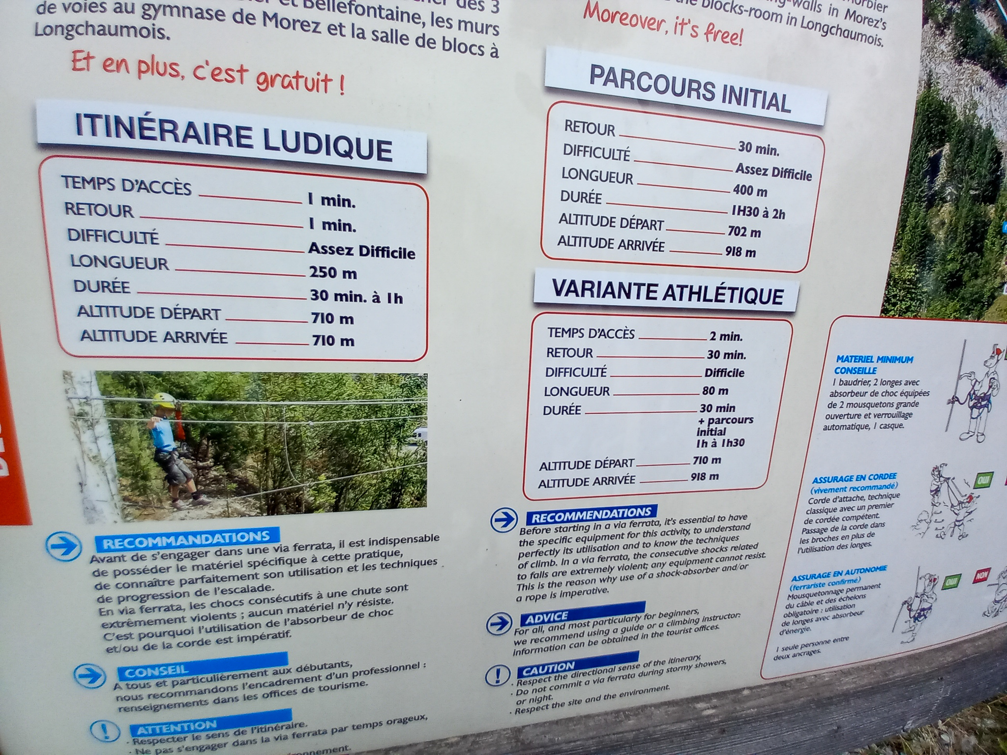 Nous aurons fait les trois parties de la via dans la matinée. Arrivés au belvédère, il faut revenir à pied au départ en suivant un bon chemin de randonnée. Nous sommes partis à gauche là-haut pour arrivée au centre ville. Il est possible de prendre à droite pour revenir vers le bas de la ville qui est un peu plus proche du parking. L’accès était gratuit, nous n’avons pas vu de droit de passage sur le panneau. Il y a une cabane de location de kits de via pour ceux qui n’en disposent pas.