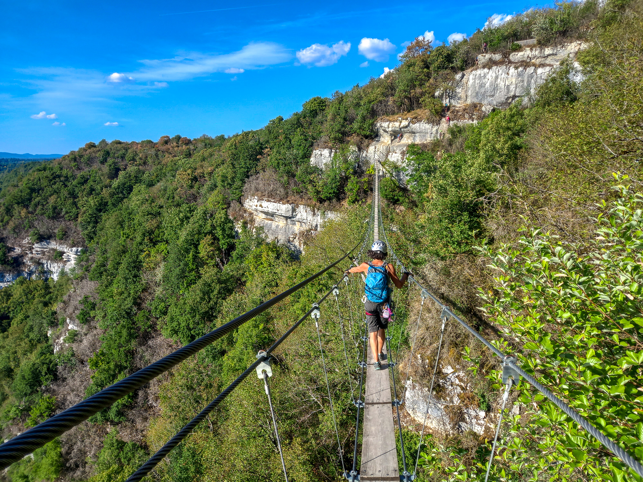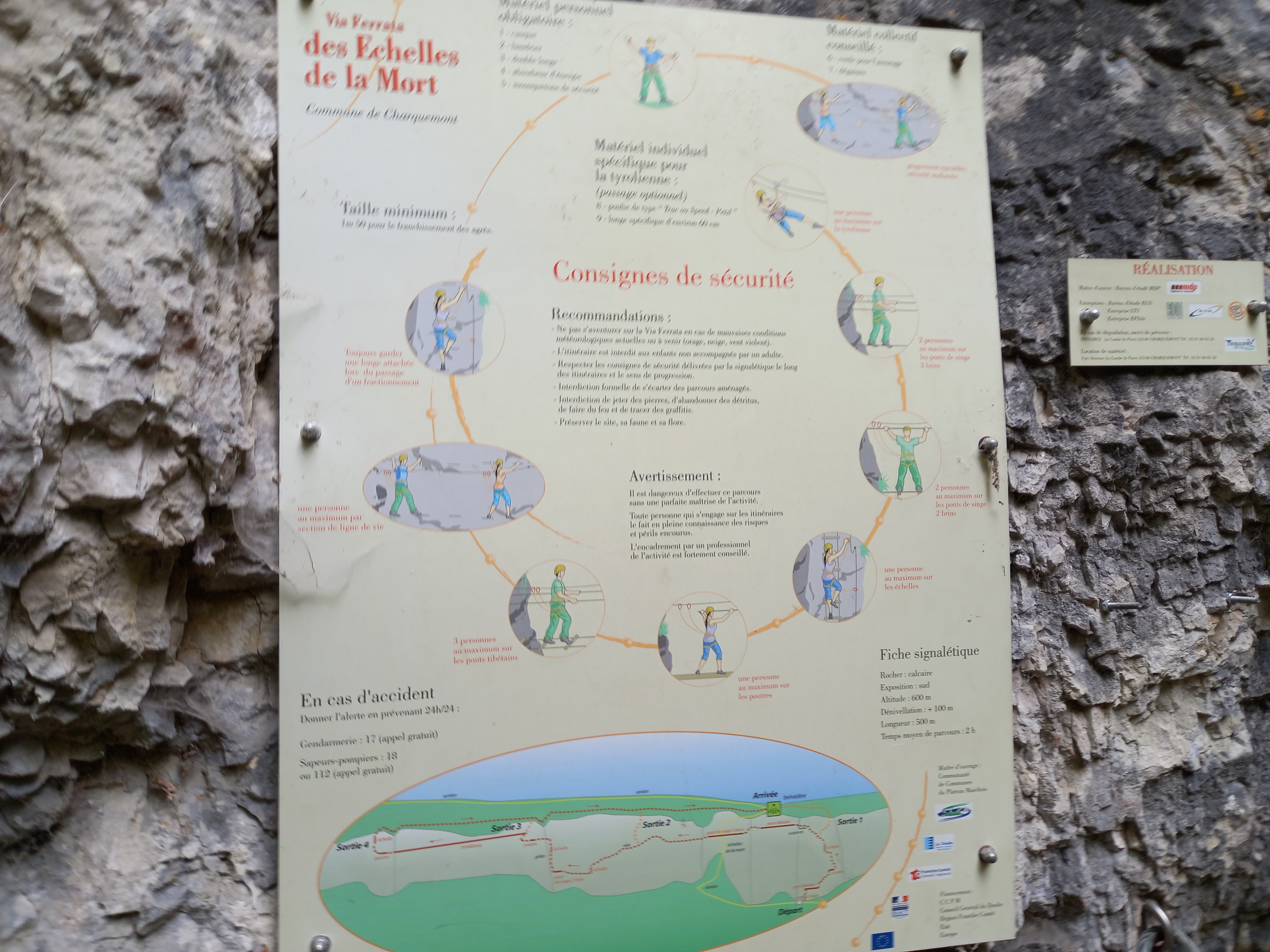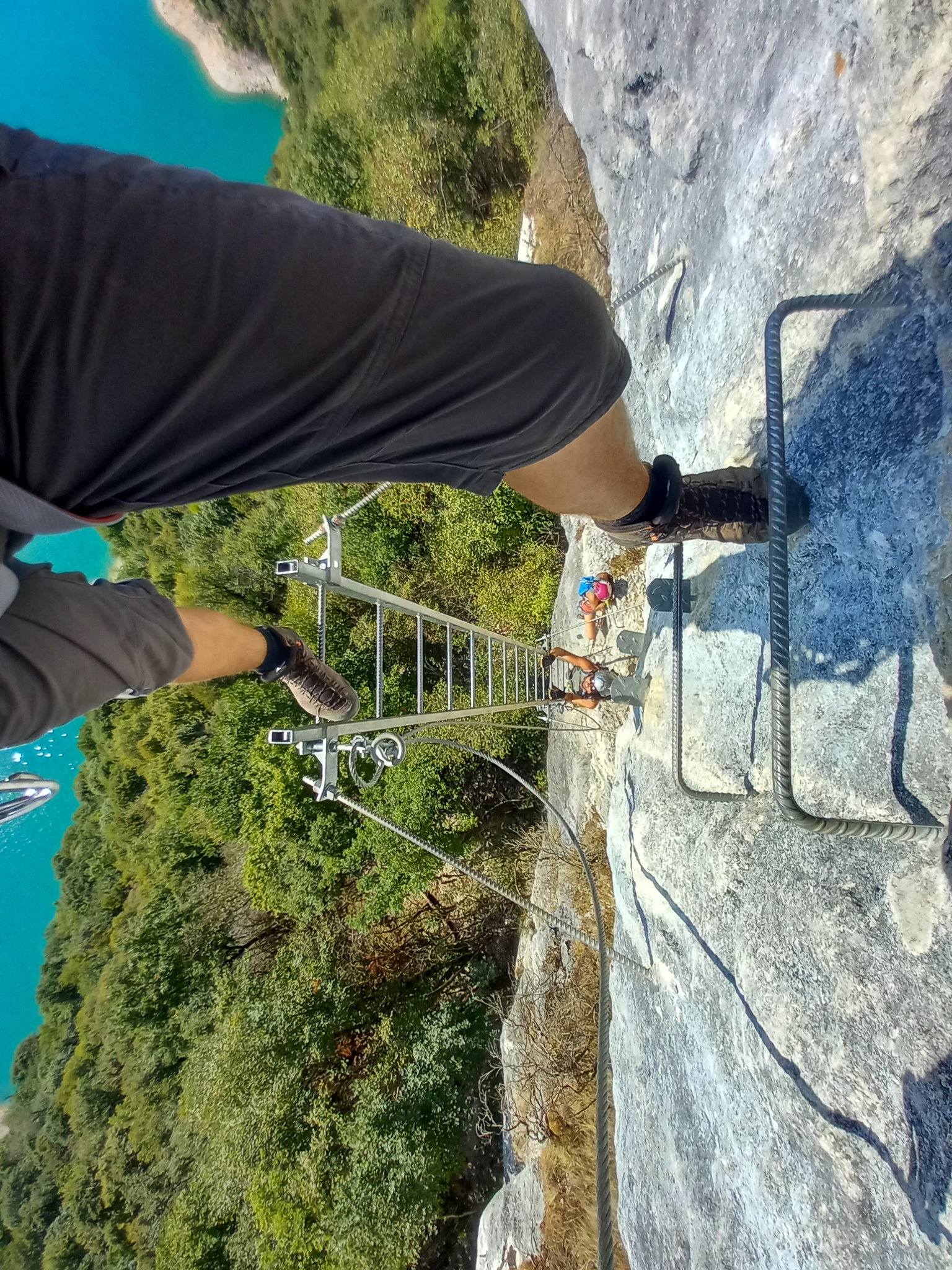 La chaleur est forte, le soleil plus que radieux. La via n’est vraiment pas difficile. La plus grande difficulté pour nous, qui sommes grands, venait de l’écartement plutôt faible entre les barreaux de pieds et ceux de mains. Une bonne nouvelle pour les ferratistes de petite taille. C’est vrai qu’en regardant le panneau d’information de la via, il est bien précisé qu’elle est accessible dès 1,25 m, alors que souvent la taille mini est entre 1,35 et 1,40 m… Ceci explique cela !