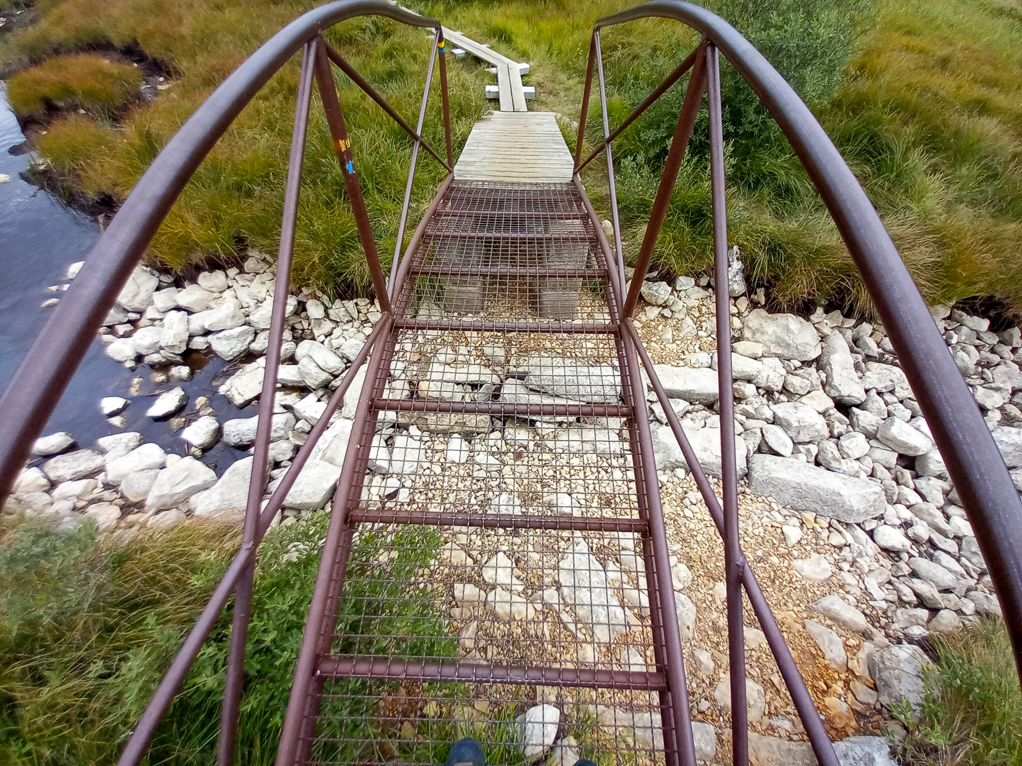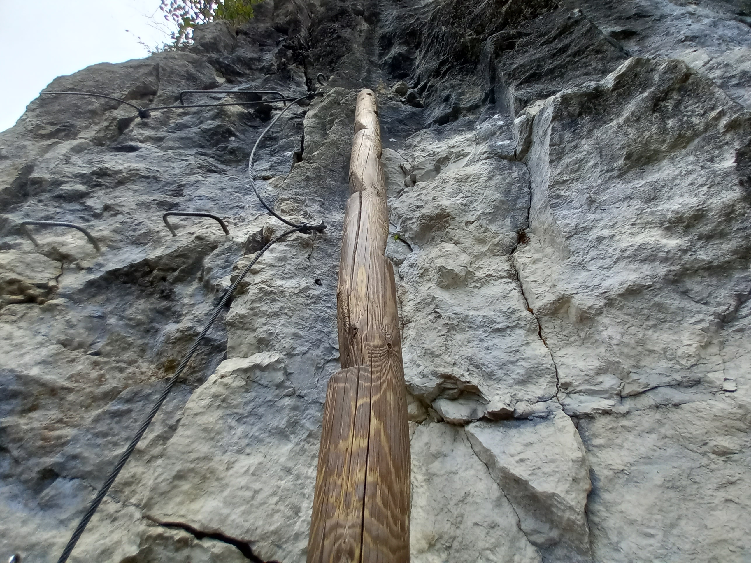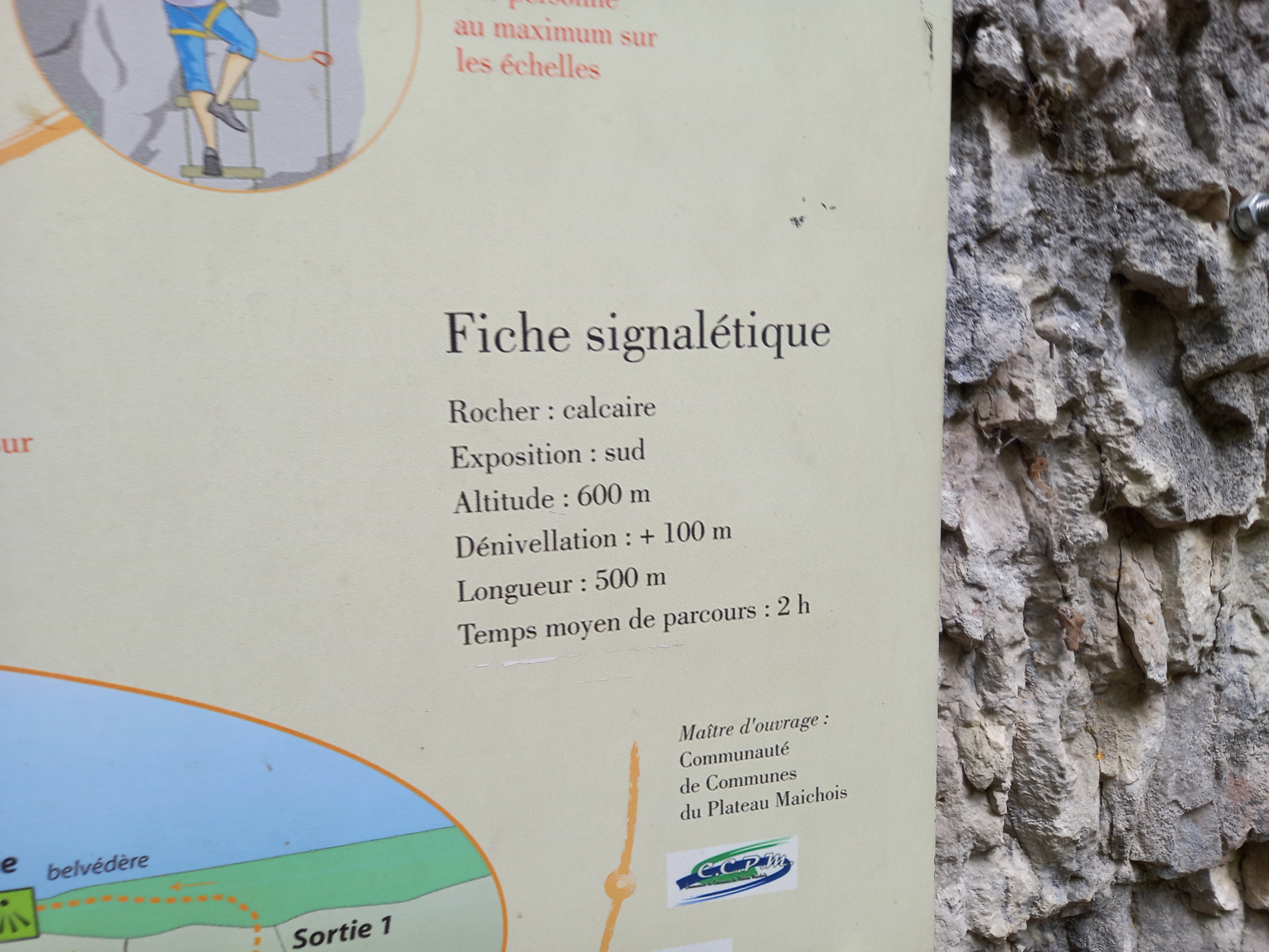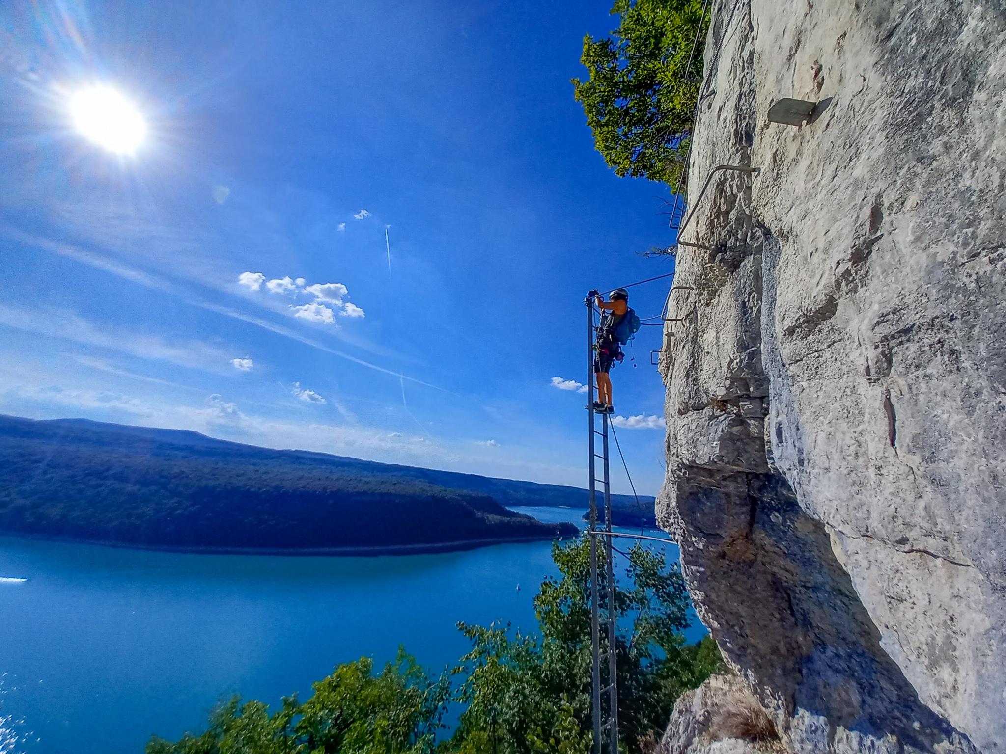 La chaleur est forte, le soleil plus que radieux. La via n’est vraiment pas difficile. La plus grande difficulté pour nous, qui sommes grands, venait de l’écartement plutôt faible entre les barreaux de pieds et ceux de mains. Une bonne nouvelle pour les ferratistes de petite taille. C’est vrai qu’en regardant le panneau d’information de la via, il est bien précisé qu’elle est accessible dès 1,25 m, alors que souvent la taille mini est entre 1,35 et 1,40 m… Ceci explique cela !