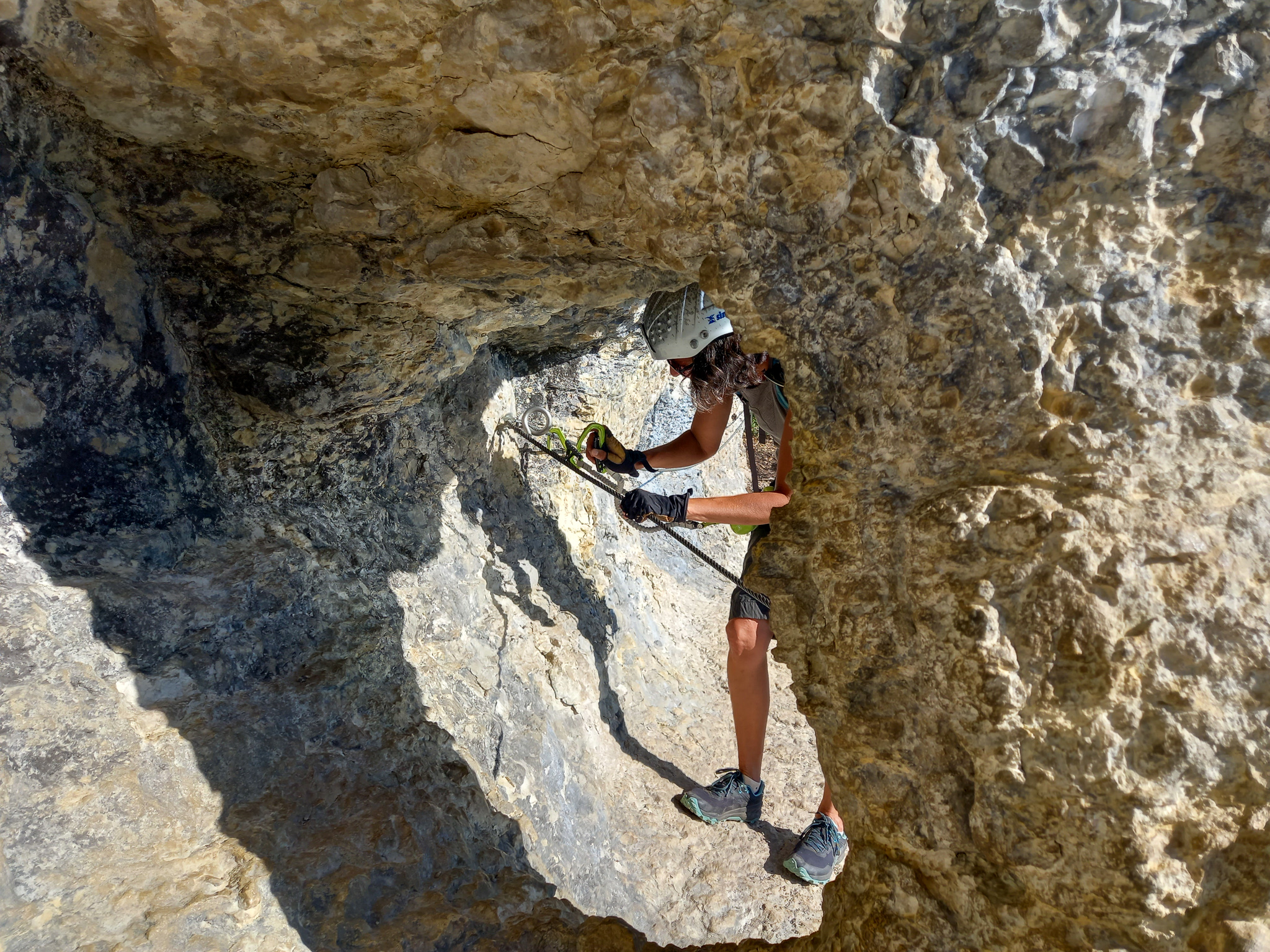 ° Le ludique, qui reste sur le bas de la carrière et qui serpente d’un flanc à l’autre. Rien de compliqué, avec une succession de passerelles plus ou moins stables et une grande tyrolienne d’une soixantaine de mètres à la fin. La tyro demande une poulie type Tandem Speed. Il faut compter entre 15 et 30 minutes pour effectuer cette boucle. Contrairement au cheminement athlétique, cette boucle est indépendante. Il est même possible de prendre un échappatoire/accès, pour ne pas faire ou ne faire que la tyrolienne.