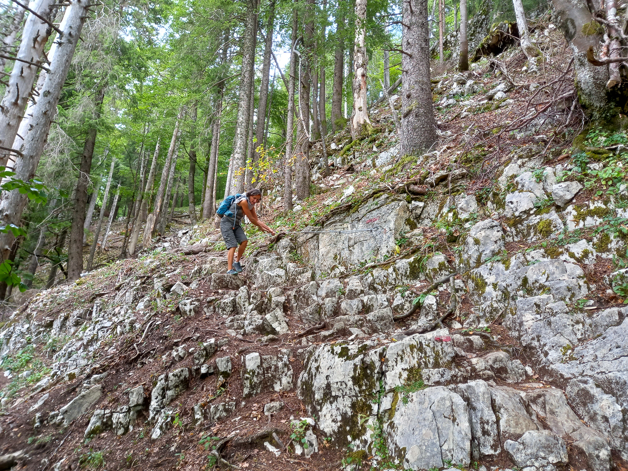 Le ciel est clément, le cadre magnifique. La petite montée vers le rocher Bernard se fait sans piège. De là-haut, la vie est vraiment belle. Après la croix de la Roche Champions la descente est un peu raide, mais un câble permet de se rassurer dans les passages délicats.