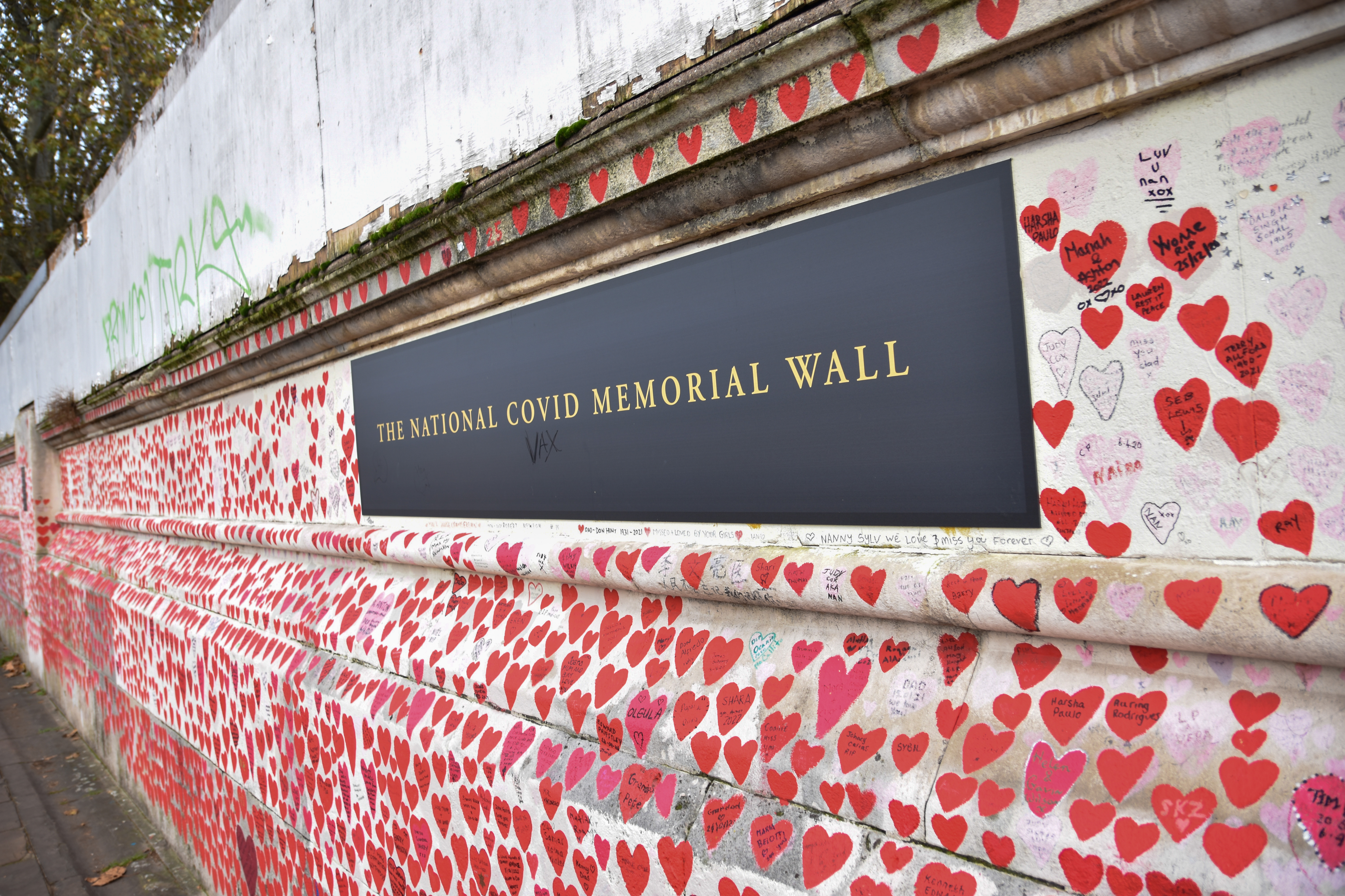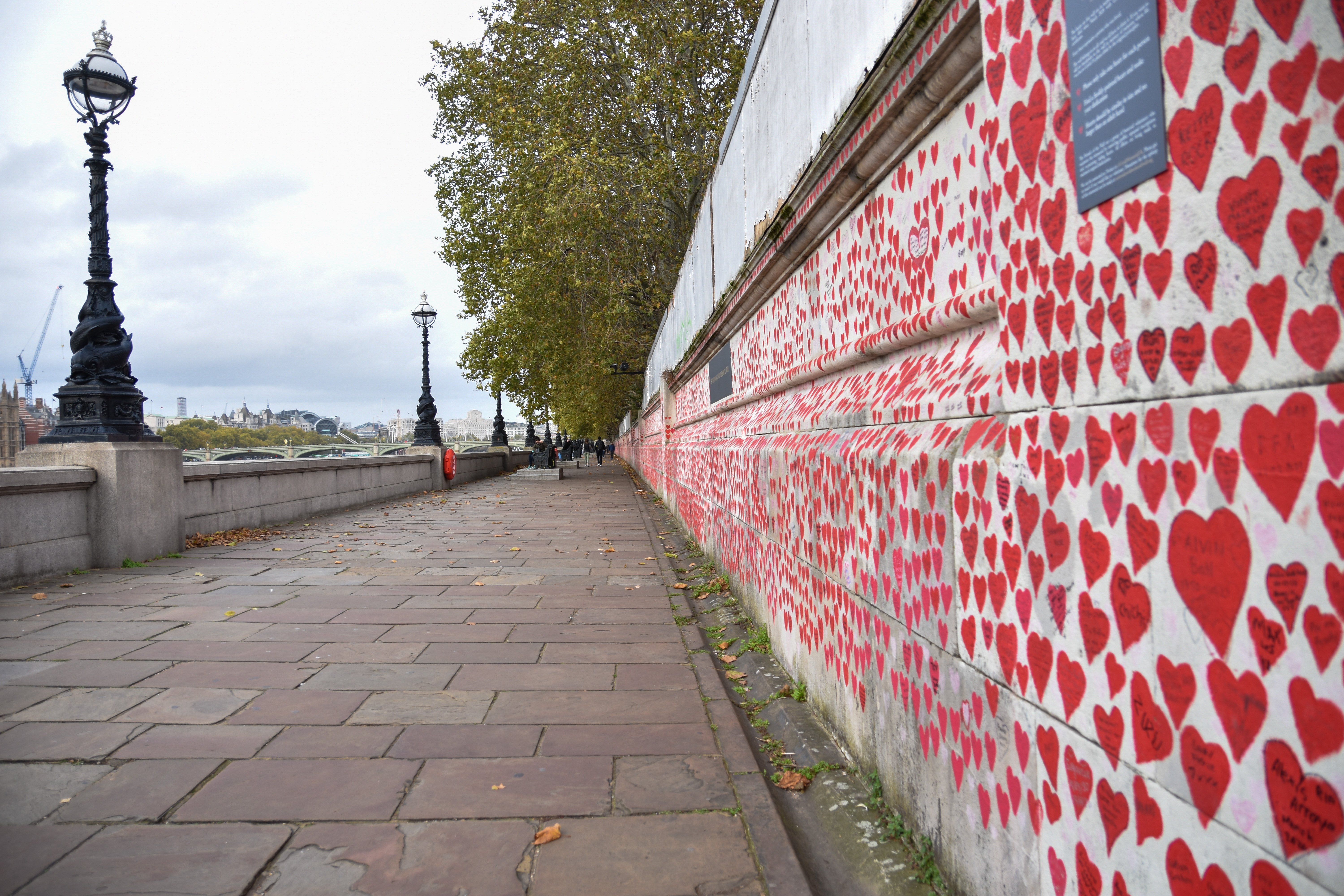 Petit passage par les Victoria Tower Gardens, un petit parc urbain et nous franchissons la Tamise pour voir Westminster de l’autre côté du fleuve, le long du The National Covid Memorial Wall, un mur mémorial aux victimes anglaises du covid. Un long mur de près de 500m sur lequel environ 150 000 cœurs ont été dessinés. L’idée était de pouvoir laisser un nom, une pensée, dans un cœur, en mémoire d’une victime anglaise. Plus de 170 000 personnes décédées dans le pays.