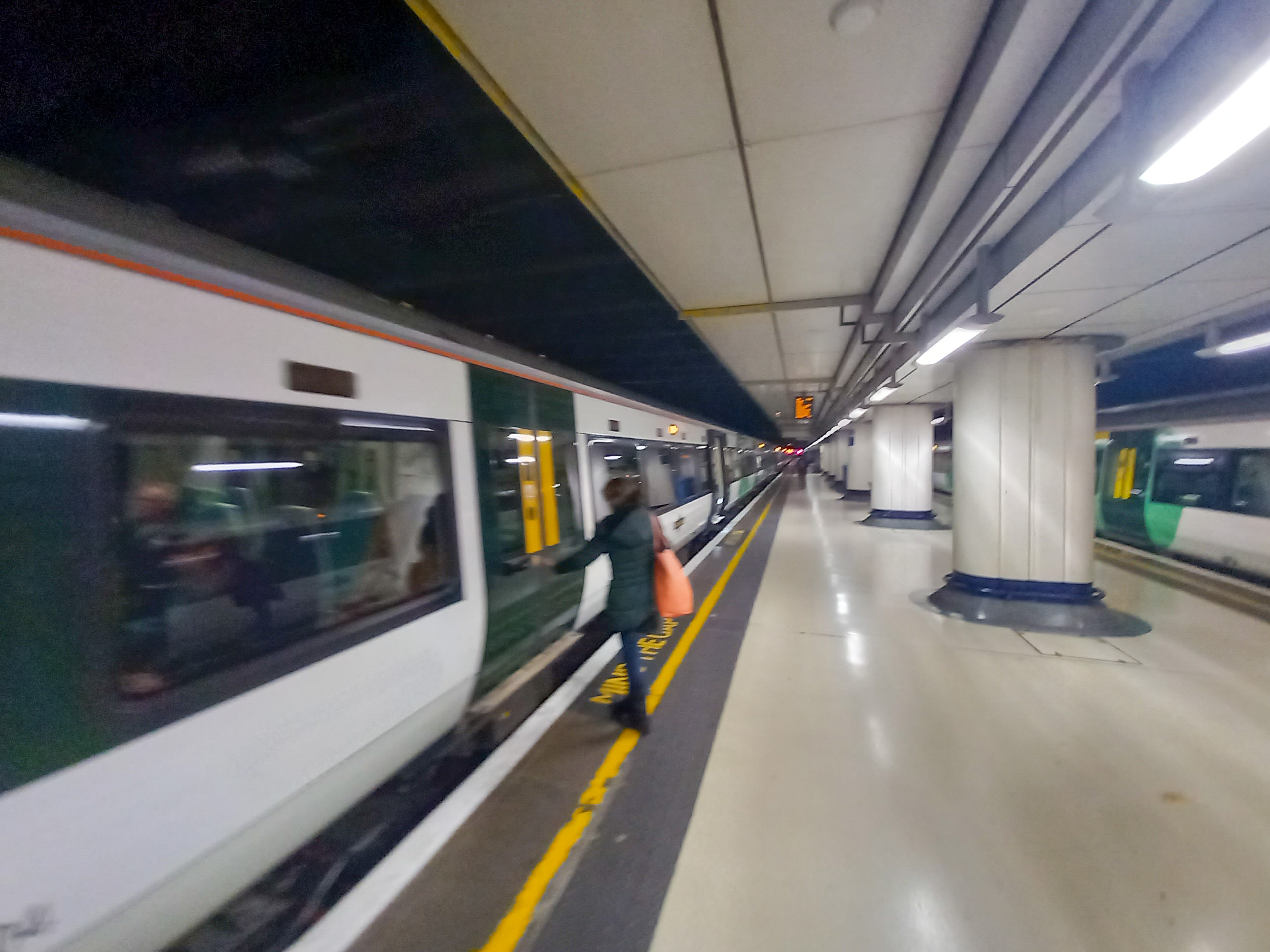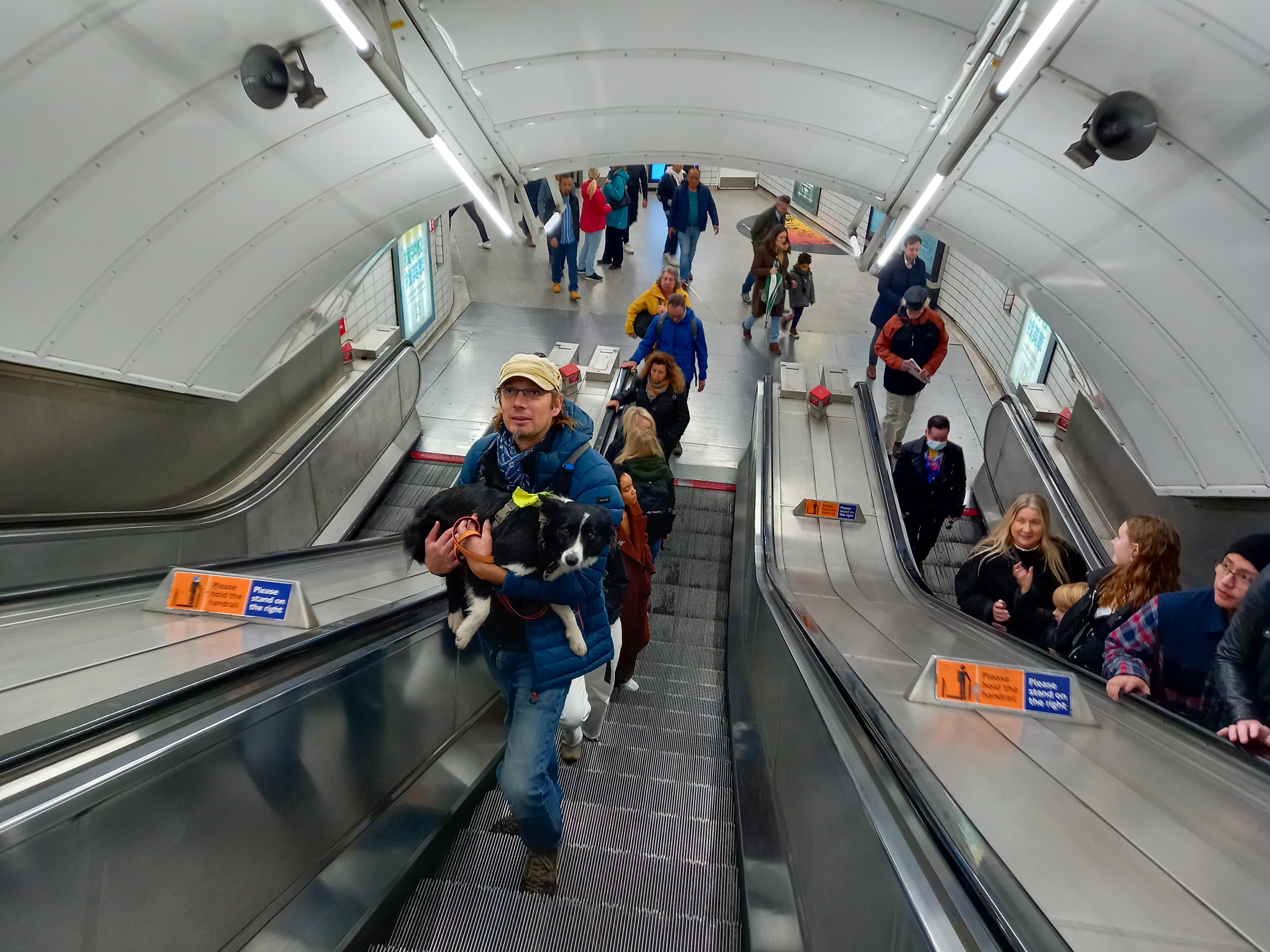 Nous prenons le train à Dorking pour nous rendre à Londres. Sans trop savoir ce qu’il faut ou non comme type de billet. Le guichetière du réseau ferré nous propose un pass train/métro/bus valable toute la journée au coeur de Londres et sur les lignes de train du sud londonien. Il nous en coutera 29 euros pour les quatre. Le transport est gratuit pour Sixa, qui reçoit même des gâteaux de la guichetière. Les chiens font partie de la vie anglaise, pas de restriction dans les wagons, pas besoin de muselière. Il faudra juste faire attention en portant le toutou sur les nombreux escalators de l’Underground.