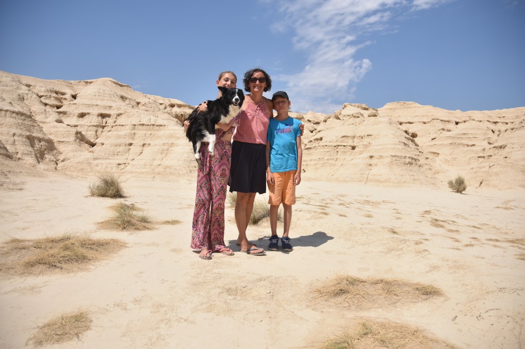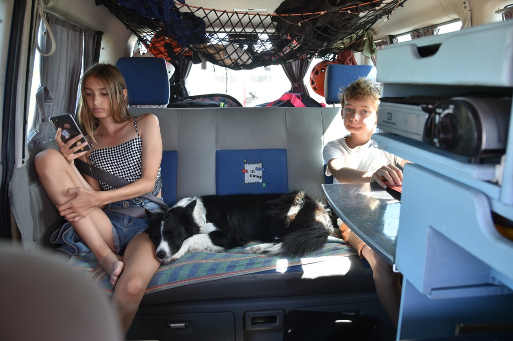 En fait les choses se sont fait naturellement. Sixa est à l’arrière quand on roule, câlinée par les enfants ou en mode dodo. A l’arrêt, quand il faut s’activer pour la vie collective (repas..), elle est à l’arrière, câlinée par les enfants ou en mode dodo. Quand on mange, elle est à l’arrière, câlinée par les enfants ou en mode dodo. Quand il est l’heure de faire dodo… elle est sur nous à faire la fête et des léchouilles partout.